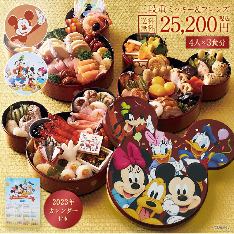 豪華特典は、記念に描き起こしたオリジナルデザインであふれていて、ミッキー&フレンズが描かれたお重は、デザイン風呂敷に包まれ、可愛いぽち袋、祝い箸もセットされ、ポスター風に飾れる2023年度年間カレンダーまでついた、プレミアム感いっぱいの、誰かに自慢したくなるおせちです。